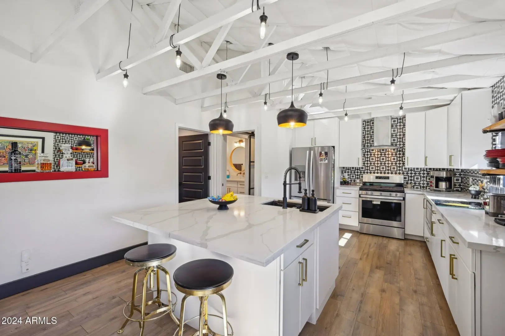 MOTIVATED SELLER! Do you dream of having a home so inviting, so luxurious, so tranquil, that you never want to leave? Welcome to this unique gem in the heart of Phoenix updated with a modern flair! Features include remodeled never used gorgeous guest bathroom, NEW ROOF just finished days ago, gorgeous open kitchen, and wooden beams and draped vaulted ceilings. Extravagant upgrades, custom tiles and open concept makes this bright light home a designer's masterpiece. No detail was overlooked and extends outdoors to the RESORT LIKE backyard. Enjoy days into nights in your fiberglass saltwater HEATED pool with extra jets for hot tubbing. Relish laying in your outdoor floating bed/entertainment area, or your firepit and gazebo equipped with a gas line and pavers and turf. Don't miss out!!!!