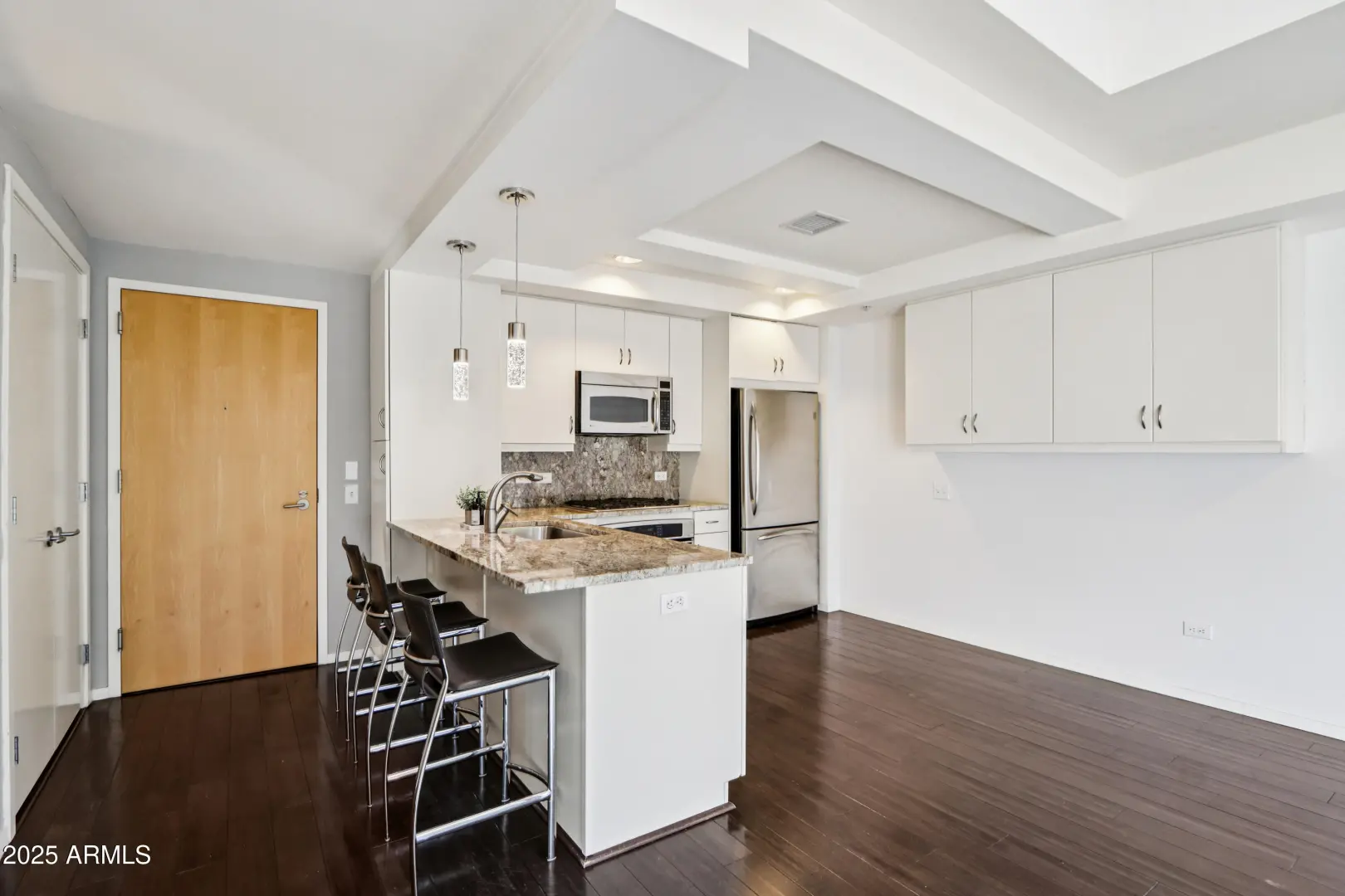 You will not want to miss this 1 bed 1 bath condo located in the highly sought after Optima Camelview. This unit is located on the 5th level of building, just steps away from the elevator. This unit has a spacious open floor plan. The kitchen comes complete with white cabinets, granite countertops, stainless steel appliances, including a gas cooktop, kitchen island seating & upgraded pendulum lighting. The family room has direct access to the balcony overlooking all of the lush greens & common areas the Optima has to offer. Amenities include 24,000 square foot state of the art fitness gym, indoor lap pool, 2 jacuzzi pools, basketball / racquetball court, men & women's locker rooms, steam room, BBQ areas, private dog park, water features, putting green, dry cleaners.....