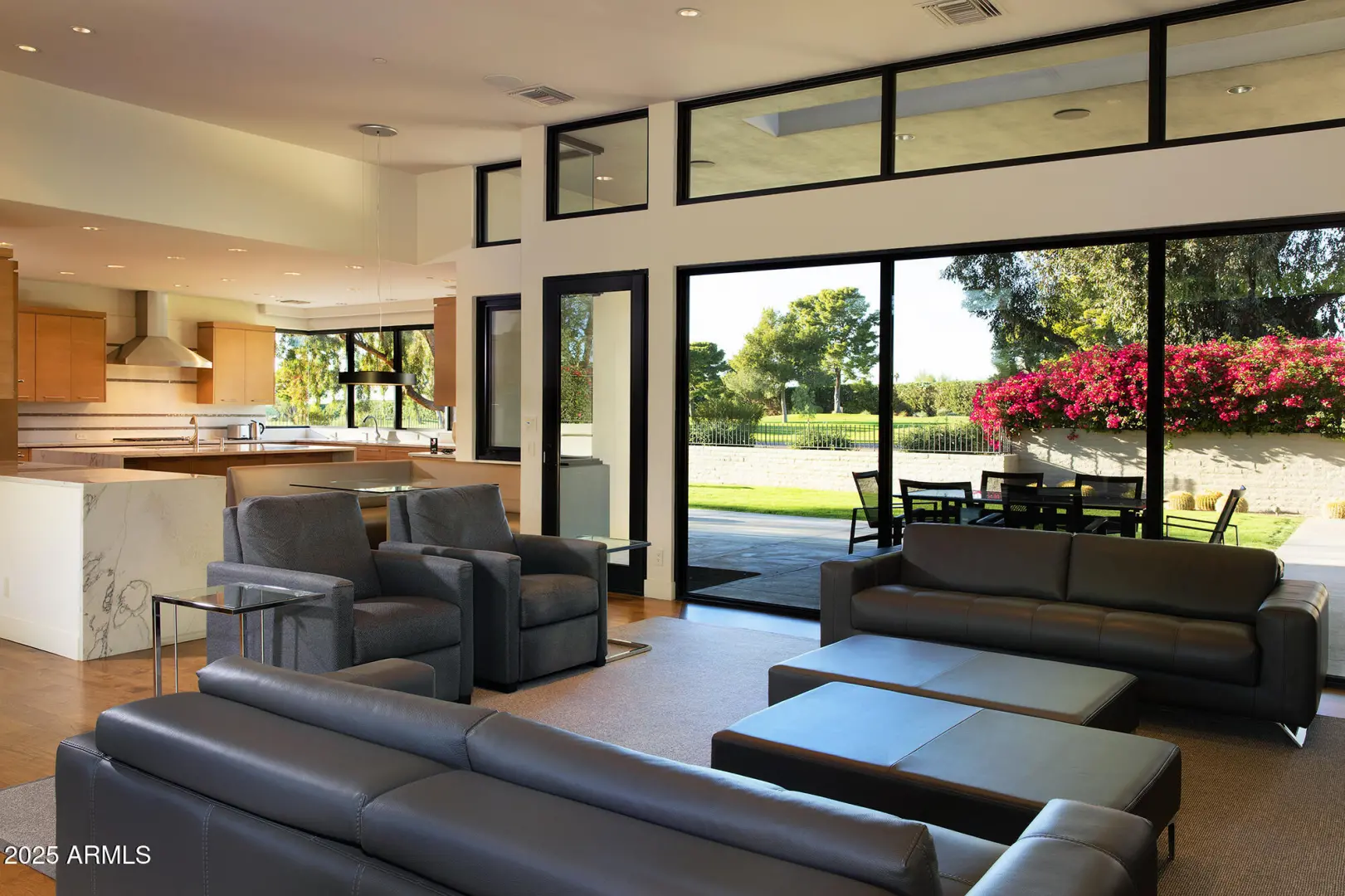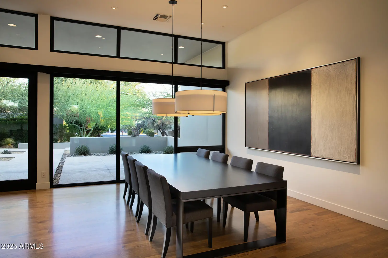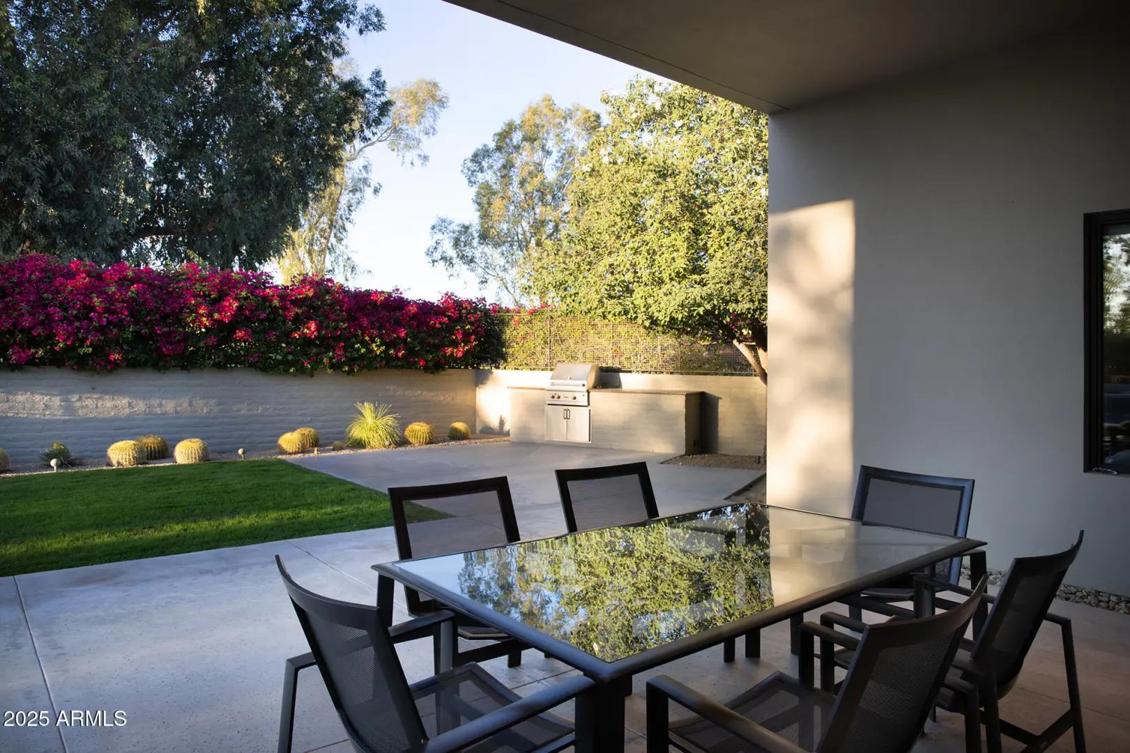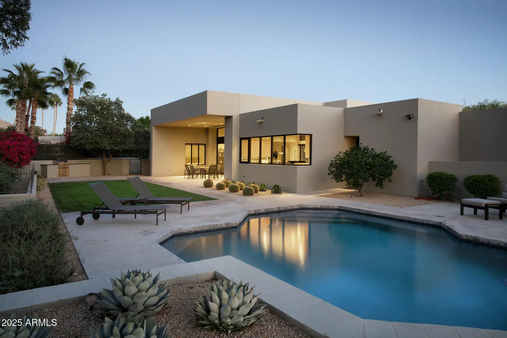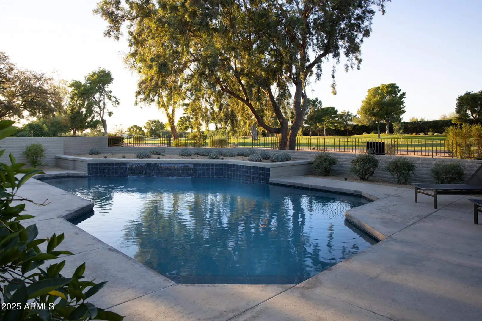 Nestled within the tranquil guard-gated private golf community Pinnacle Peak Country Club Estates, this exquisite custom rebuild by GM Hunt, architecturally reimagined by Hugh Knoell, captures the essence of refined desert living. Positioned on a private cul-de-sac lot overlooking double fairways, the residence showcases breathtaking mountain and golf course views while offering exceptional privacy and serenity—just moments from North Scottsdale's premier shopping, fine dining, and entertainment. The home's exterior exudes architectural sophistication, featuring smooth-texture stucco, a custom Western door and window package, slump block privacy walls with metal fencing, and artisan-crafted metal gates. Designed for outdoor enjoyment, the backyard oasis offers a refinished pool, built-in