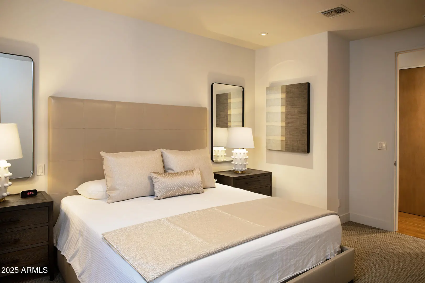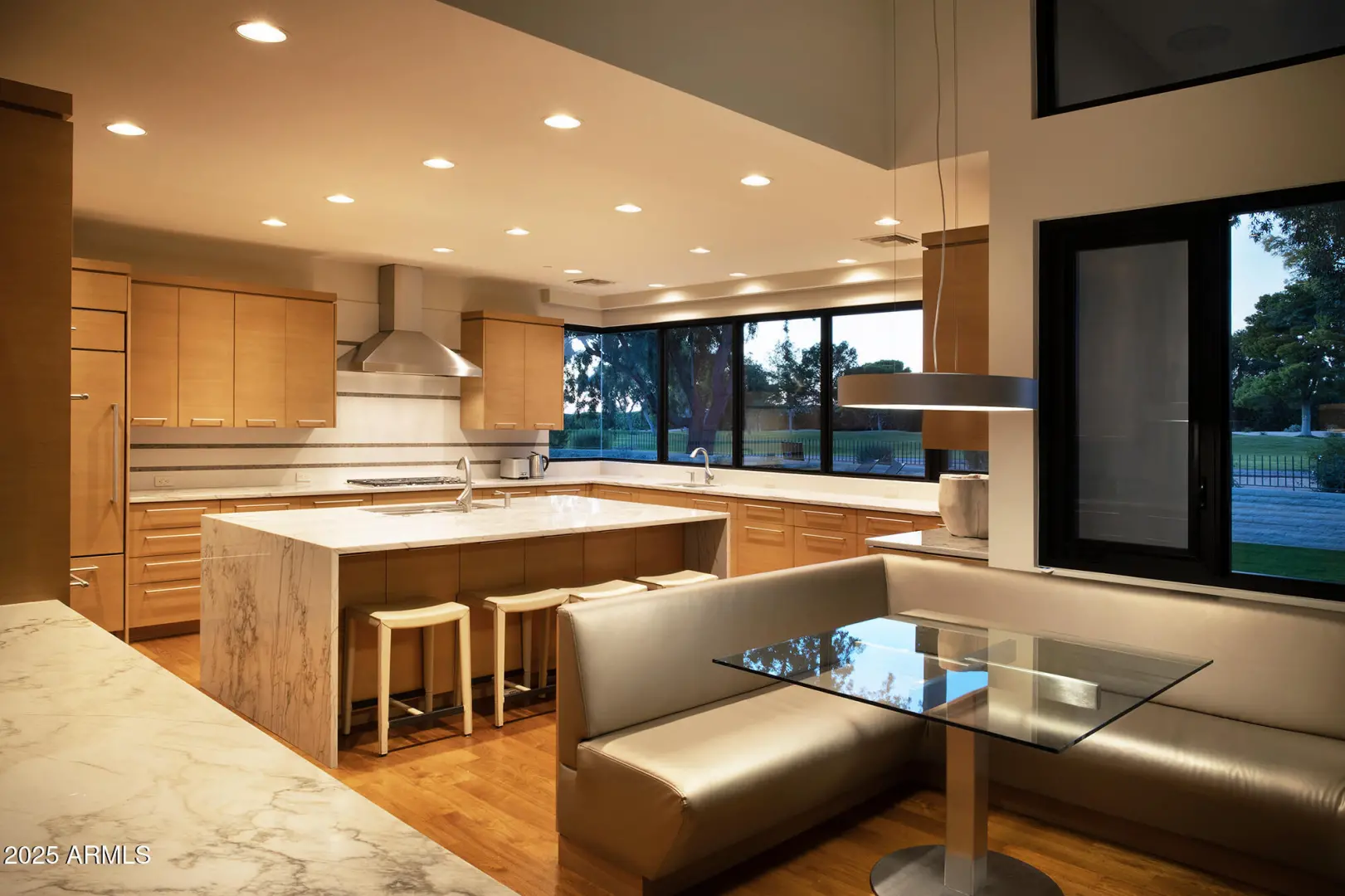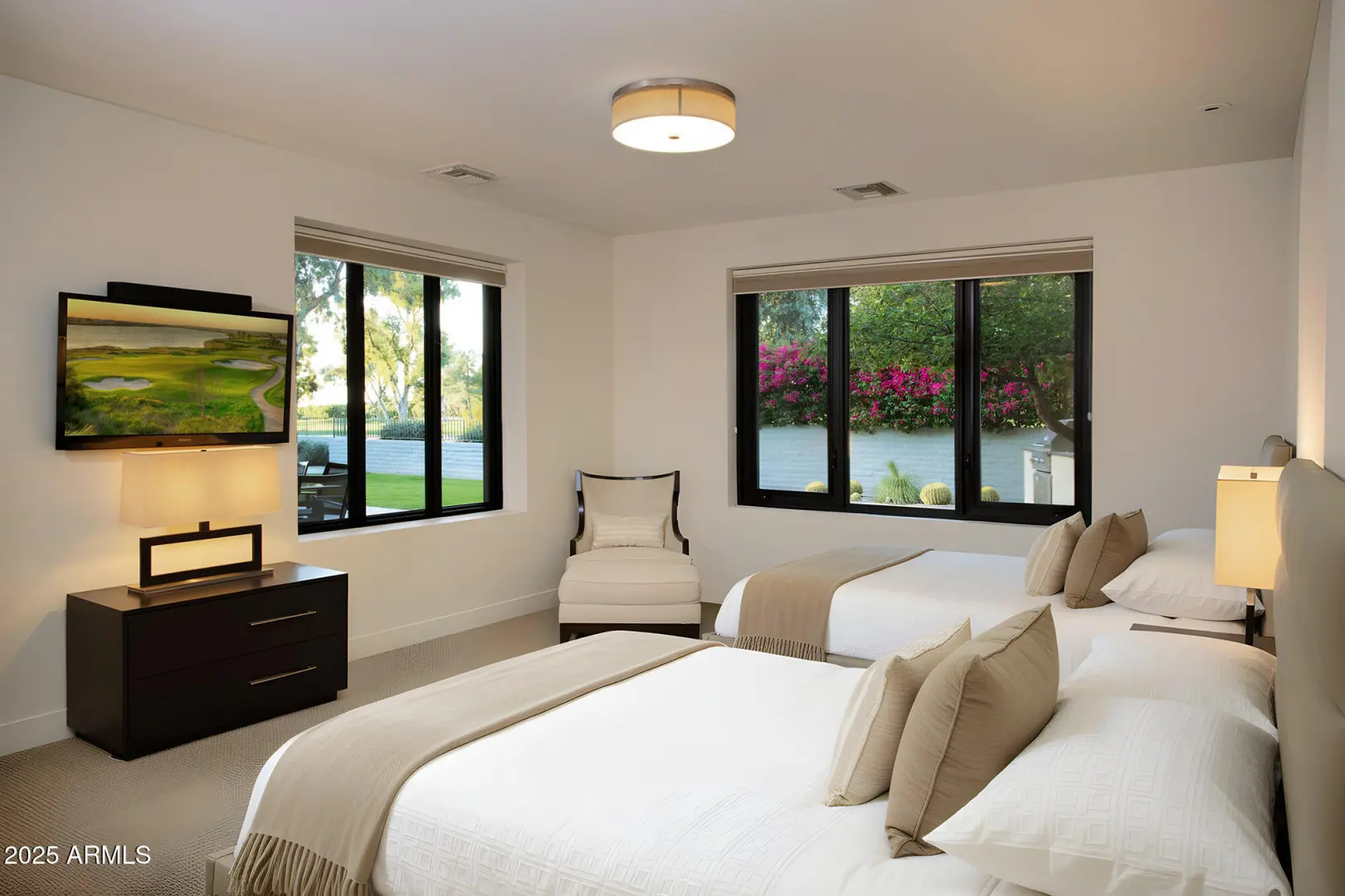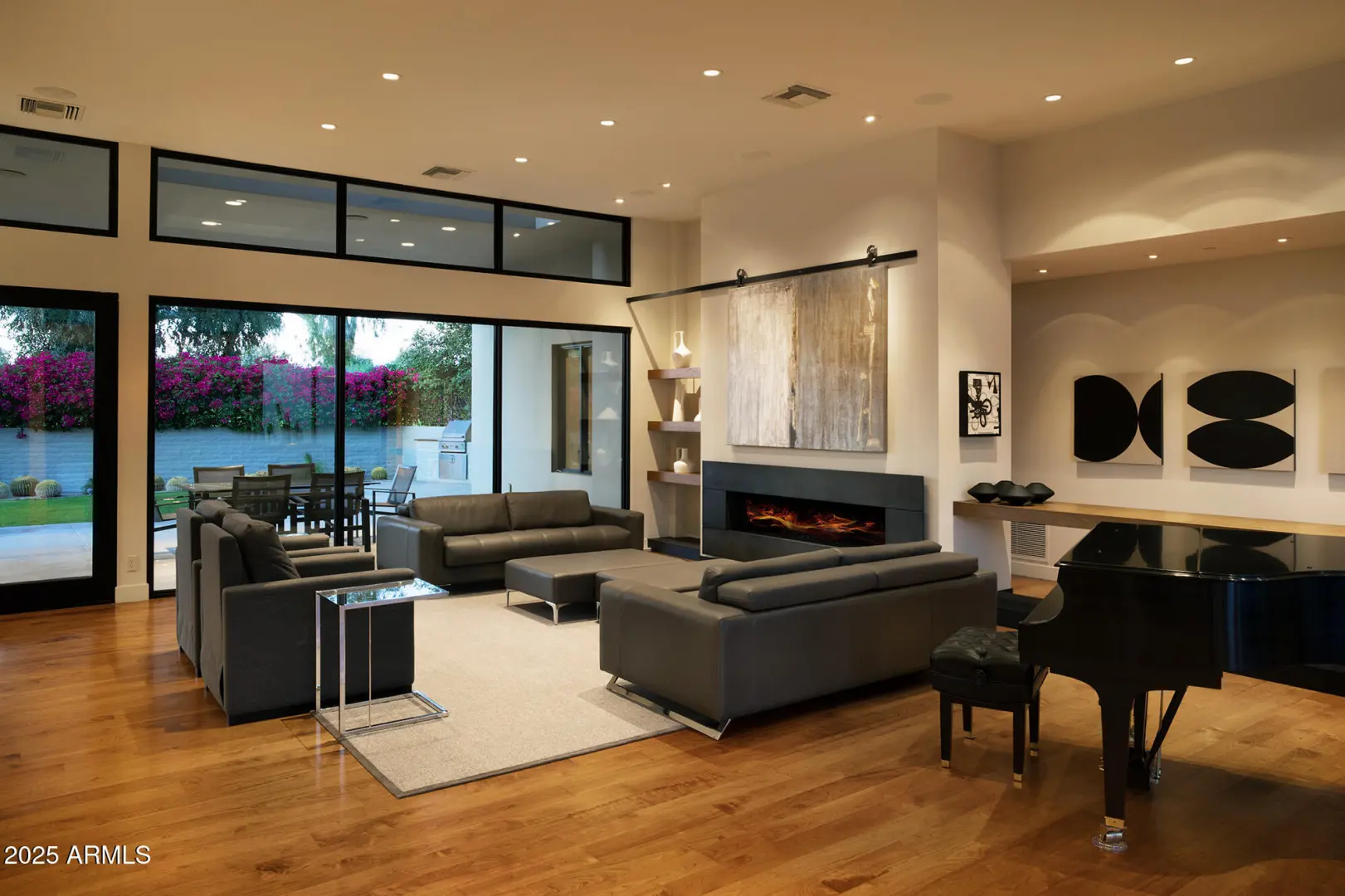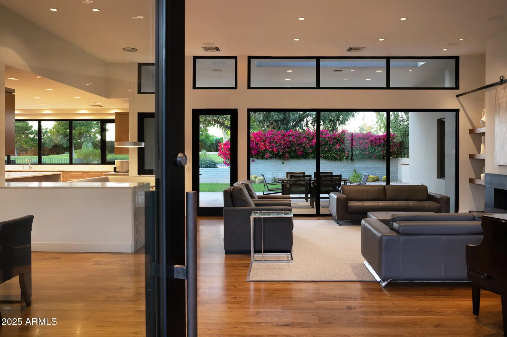 Nestled within the tranquil guard-gated private golf community Pinnacle Peak Country Club Estates, this exquisite custom rebuild by GM Hunt, architecturally reimagined by Hugh Knoell, captures the essence of refined desert living. Positioned on a private cul-de-sac lot overlooking double fairways, the residence showcases breathtaking mountain and golf course views while offering exceptional privacy and serenity—just moments from North Scottsdale's premier shopping, fine dining, and entertainment. The home's exterior exudes architectural sophistication, featuring smooth-texture stucco, a custom Western door and window package, slump block privacy walls with metal fencing, and artisan-crafted metal gates. Designed for outdoor enjoyment, the backyard oasis offers a refinished pool, built-in